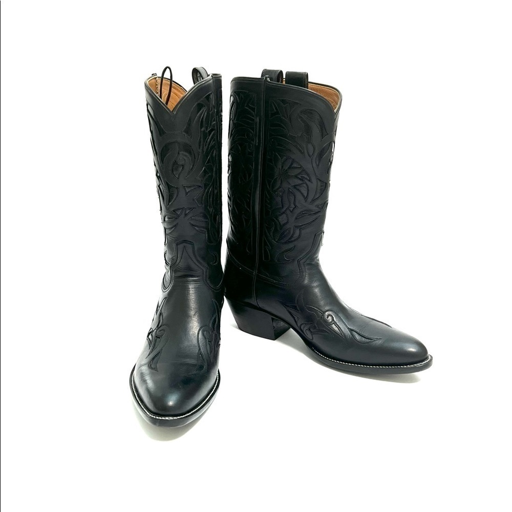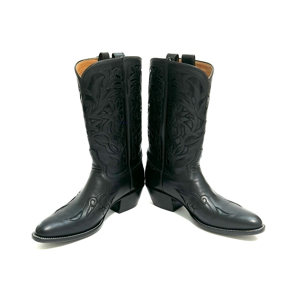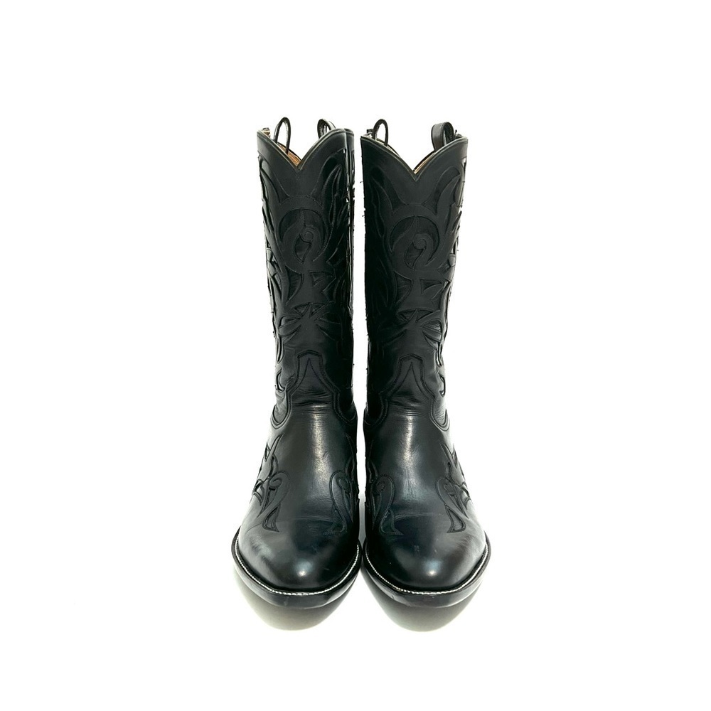 Vintage 1990s mens black leather custom handmade floral cowboy boots by Rocketbuster. Features black leather uppers, narrow rounded toe, custom floral cutout motif at vamp and shaft, sloped tops, internal pull on loops, mid calf rise, and slanted block heel. Handmade in El Paso, Texas. Heel to toe (inside shoe): 11